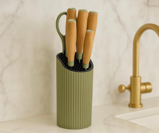 7-PIECE STAINLESS STEEL KNIFE SET – ERGONOMIC WOOD HANDLES + STAND - GREEN