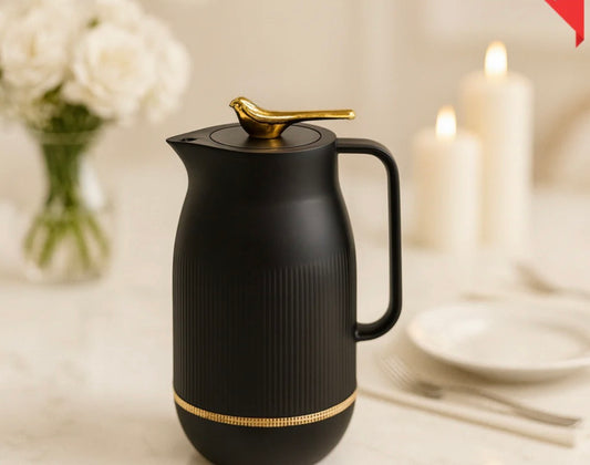 VACUUM INSULATED THERMAL KETTLE 1 LITRE – BLACK WITH GOLD BIRD HANDLE LUXURY DINING