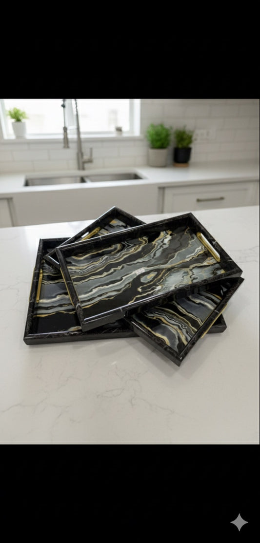 3-Pieces Black Aesthetic & Gold Marble-look Serving Tray set