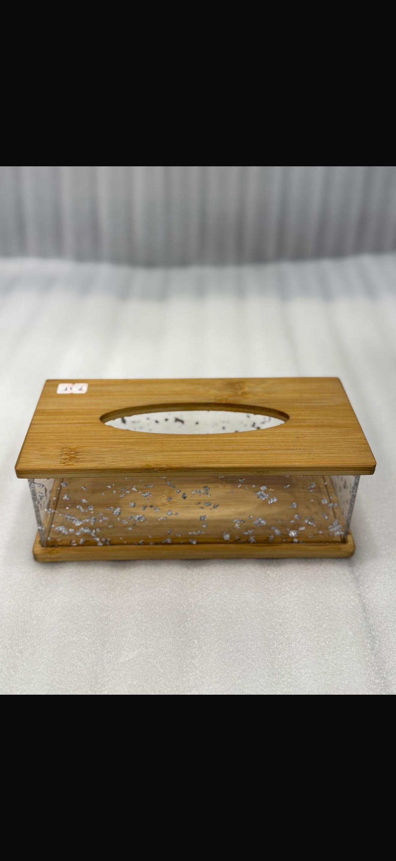 Premium Bamboo wooden acrylic tissue box with silver flakes.