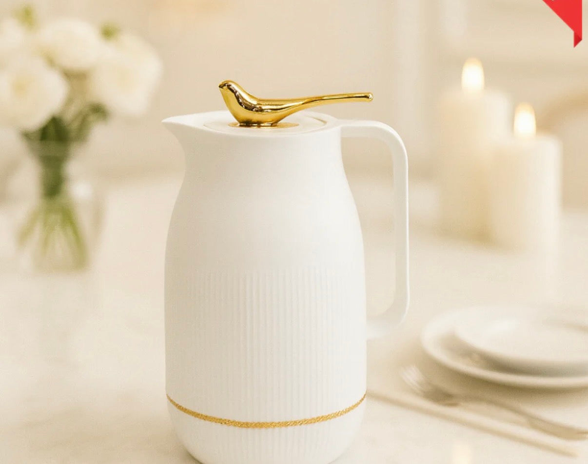 VACUUM INSULATED THERMAL KETTLE 1 LITRE – WHITE WITH GOLD BIRD HANDLE LUXURY DINING