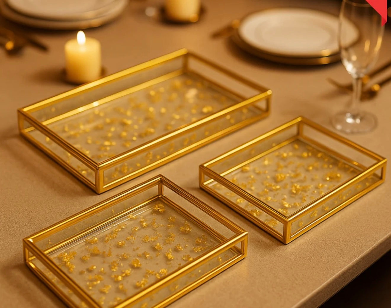 Add elegance and functionality to your serving experience with our Wooden Serving Tray set of 3 in Golden Color and Transparent Inner Area with Golden border Designed for both style and durability, these trays are perfect for serving tea, coffee, snacks, desserts, or full meals with ease.
