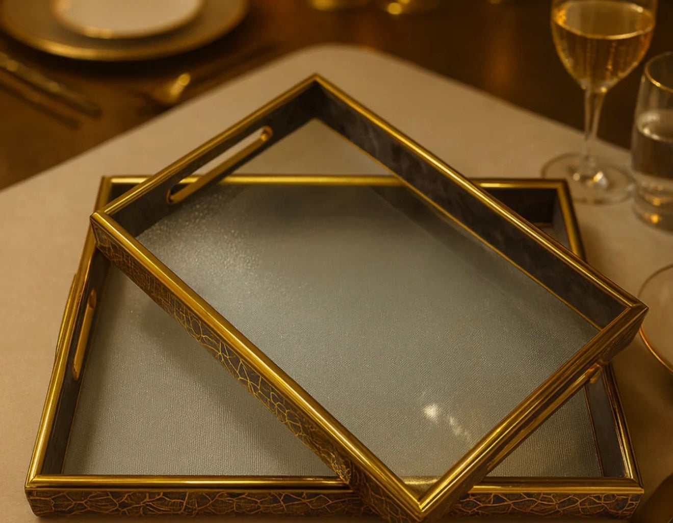 Add elegance and functionality to your serving experience with our Wooden Serving Tray set of 3 in Golden Color and Transparent Inner Area with Golden border Designed for both style and durability, these trays are perfect for serving tea, coffee, snacks, desserts, or full meals with ease.