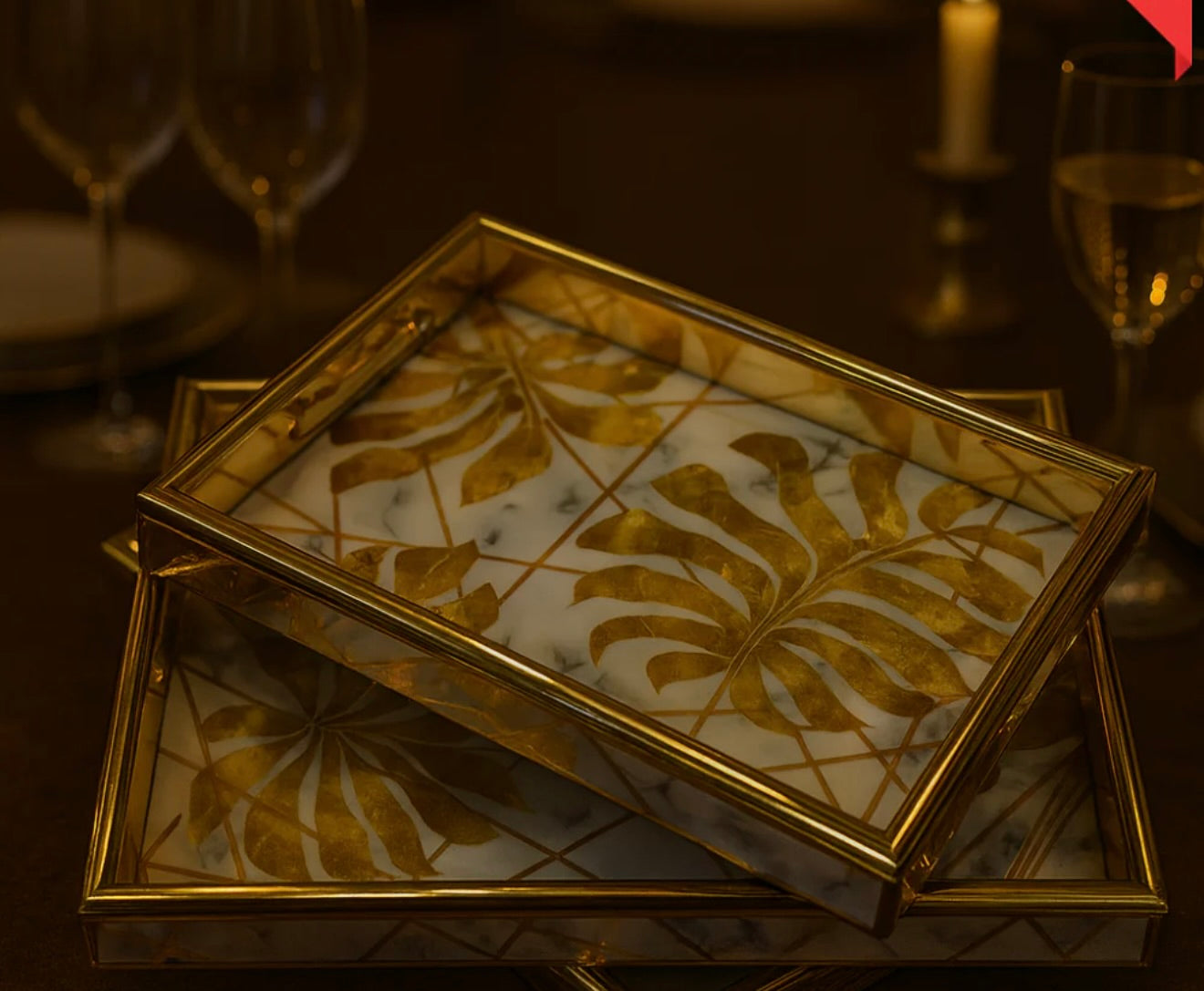 PREMIUM WHITE MARBLE EFFECT TRAYS – GOLD LEAF PATTERN - 3-PIECES SET